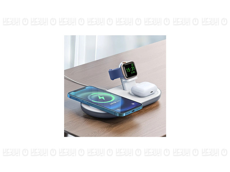 مقدار توان ورودی این محصول 18 الی 36 وات است. همچنین توان خروجی این شارژر بی سیم نیز 15، 10، 7.5 و 5 وات است. برای استفاده از این شارژر بی سیم کافی است آن را بر روی میز کار یا یک سطح صاف قرار دهید؛ سپس گوشی موبایل را بر روی استند تعبیه شده و اپل واچ و ایربادز خود را مطابق تصویر زیر قرار دهید و آنها را شارژ کنید. در نظر داشته باشید شارژر ساعت خود را نیز در محل جایگاه ساعت قرار دهید.