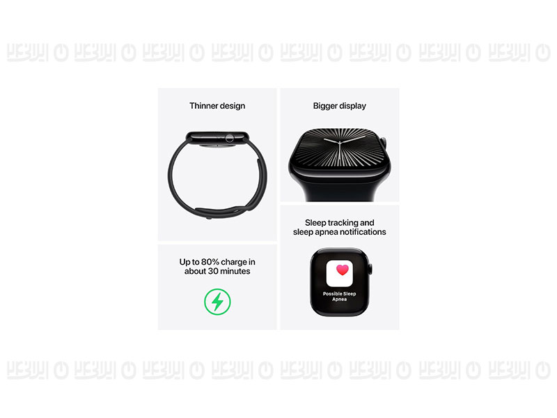ساعت هوشمند اپل مدل Series 10 با ابعاد 46x39x9.7 میلیمتر و وزن 35.3 گرم، محصولی مناسب برای آقایان و بانوان است که هم در فعالیتهای روزمره و هم در موقعیتهای رسمی و ورزشی قابل استفاده است. جنس بدنه این ساعت از آلومینیوم بوده و در ساخت آن از شیشه Ion-X و سرامیک سافایر بهره گرفته شده است. صفحه نمایش 1.96 اینچی آن از نوع Retina LTPO3 OLED با وضوح 416x496 پیکسل و تراکم 326 پیکسل بر اینچ بوده که قابلیت روشنایی بین 1 تا 2000 نیت را دارد. این ساعت با سیستم عامل WatchOS نسخه 11 و پردازنده Apple S10 عرضه شده و از فناوریهای مکانیابی GPS، A-GPS، GLONASS، GALILEO، BDS و QZSS پشتیبانی میکند. ساعت هوشمند اپل مجهز به حسگرهای متعددی از جمله قطبنما، شتابسنج، ضربان قلب، سنجش اکسیژن خون، ژیروسکوپ، ارتفاعسنج و سنجش دمای بدن است. همچنین، قابلیت نمایشگر همیشه روشن، پایش وضعیت خواب، محاسبه کالری مصرفی و مسافت طیشده، تشخیص تصادف و سقوط از ارتفاع و پشتیبانی از Siri از دیگر ویژگیهای این محصول است. باتری لیتیوم یونی این ساعت با یک بار شارژ میتواند تا 18 ساعت در حالت عادی و 36 ساعت در حالت ذخیره انرژی کار کند. بهعلاوه، این ساعت در برابر آب تا عمق 50 متر مقاوم است و دارای گواهی IPX6 برای مقاومت در برابر گرد و غبار است. گفتنیست که سنسور اکسیژن خون در کشور ایران امکان فعال سازی و استفاده ندارد.