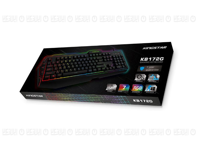 کیبورد مدل KB172G یک محصول با کیفیت از کمپانی کینگ استار است که با نورپردازی زیبای خود توجه هر کاربری را به خود جلب میکند. نورپردازی کیبورد سه رنگ به صورت ثابت در کنارههای کلیدها است و قابل تغییر به صورت اتوماتیک میباشد. این محصول دارای 107 کلید اصلی و 12 کلید مولتی مدیا و همچنین توان DC 5V ≥ +300 میلی آمپر است.