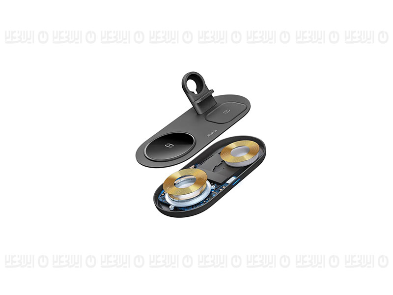 مقدار توان ورودی این محصول 18 الی 36 وات است. همچنین توان خروجی این شارژر بی سیم نیز 15، 10، 7.5 و 5 وات است. برای استفاده از این شارژر بی سیم کافی است آن را بر روی میز کار یا یک سطح صاف قرار دهید؛ سپس گوشی موبایل را بر روی استند تعبیه شده و اپل واچ و ایربادز خود را مطابق تصویر زیر قرار دهید و آنها را شارژ کنید.